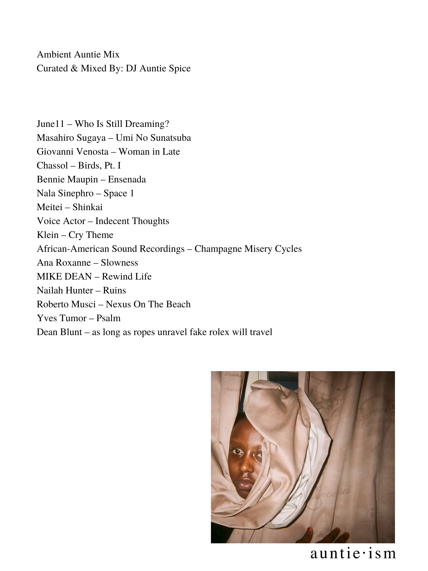 •Dutty Auntie •Somatic Auntie •Liberated Auntie •Revolutionary Auntie •Groovy Auntie •Astral Auntie •Reflective Auntie •Lite Auntie •Ambient Auntie •Natty Auntie •Miscellaneous Auntie •Motherland Auntie •Hopeless Romantic Auntie •Awakened Auntie •Esoteric Auntie •Summer Love Auntie •Madame Auntie •Juju Auntie •Boogie Auntie •Erotic Auntie •Cosmic Auntie