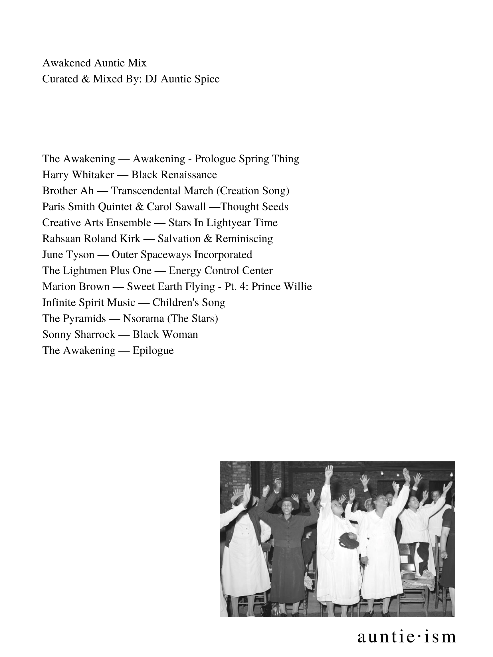 •Dutty Auntie •Somatic Auntie •Liberated Auntie •Revolutionary Auntie •Groovy Auntie •Astral Auntie •Reflective Auntie •Lite Auntie •Ambient Auntie •Natty Auntie •Miscellaneous Auntie •Motherland Auntie •Hopeless Romantic Auntie •Awakened Auntie •Esoteric Auntie •Summer Love Auntie •Madame Auntie •Juju Auntie •Boogie Auntie •Erotic Auntie •Cosmic Auntie