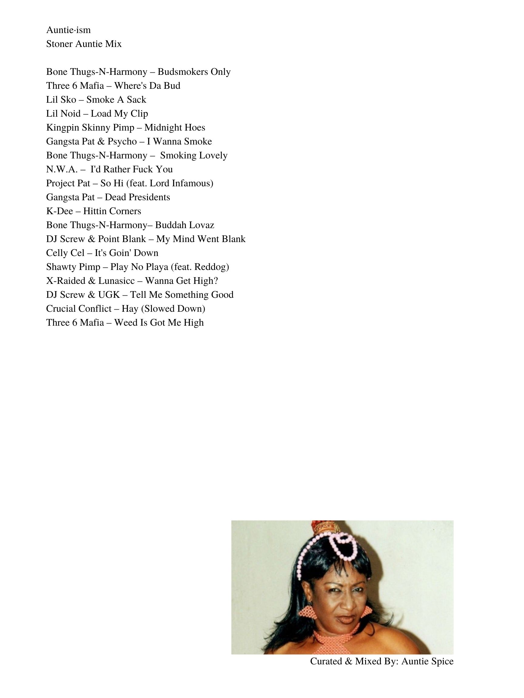 •Dutty Auntie •Somatic Auntie •Liberated Auntie •Revolutionary Auntie •Groovy Auntie •Astral Auntie •Reflective Auntie •Lite Auntie •Ambient Auntie •Natty Auntie •Miscellaneous Auntie •Motherland Auntie •Hopeless Romantic Auntie •Awakened Auntie •Esoteric Auntie •Summer Love Auntie •Madame Auntie •Juju Auntie •Boogie Auntie •Erotic Auntie •Cosmic Auntie