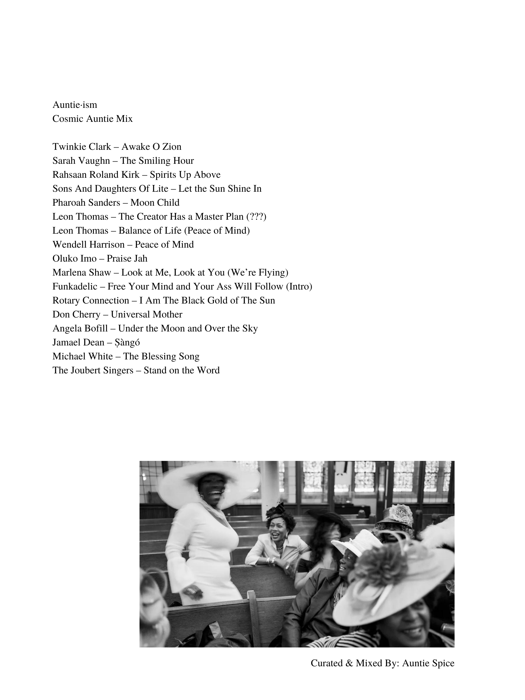 •Dutty Auntie •Somatic Auntie •Liberated Auntie •Revolutionary Auntie •Groovy Auntie •Astral Auntie •Reflective Auntie •Lite Auntie •Ambient Auntie •Natty Auntie •Miscellaneous Auntie •Motherland Auntie •Hopeless Romantic Auntie •Awakened Auntie •Esoteric Auntie •Summer Love Auntie •Madame Auntie •Juju Auntie •Boogie Auntie •Erotic Auntie •Cosmic Auntie