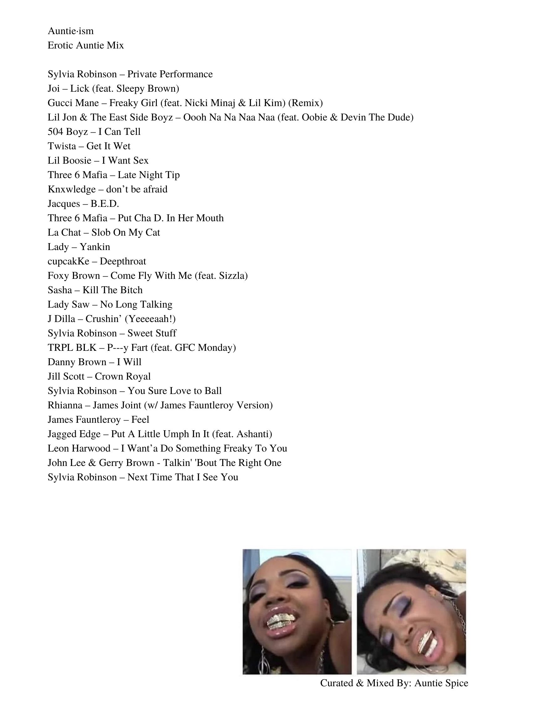 •Dutty Auntie •Somatic Auntie •Liberated Auntie •Revolutionary Auntie •Groovy Auntie •Astral Auntie •Reflective Auntie •Lite Auntie •Ambient Auntie •Natty Auntie •Miscellaneous Auntie •Motherland Auntie •Hopeless Romantic Auntie •Awakened Auntie •Esoteric Auntie •Summer Love Auntie •Madame Auntie •Juju Auntie •Boogie Auntie •Erotic Auntie •Cosmic Auntie