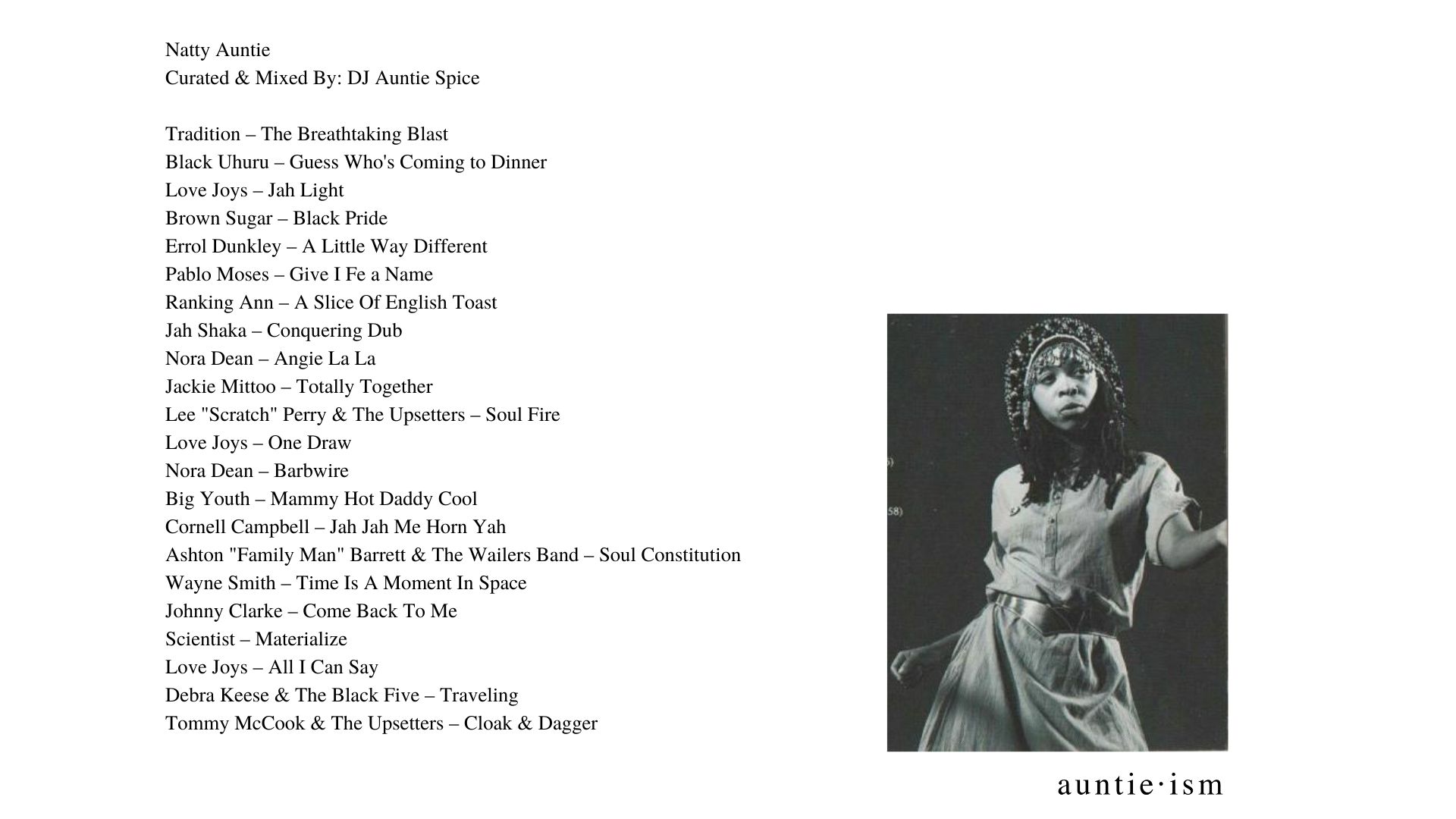 •Dutty Auntie •Somatic Auntie •Liberated Auntie •Revolutionary Auntie •Groovy Auntie •Astral Auntie •Reflective Auntie •Lite Auntie •Ambient Auntie •Natty Auntie •Miscellaneous Auntie •Motherland Auntie •Hopeless Romantic Auntie •Awakened Auntie •Esoteric Auntie •Summer Love Auntie •Madame Auntie •Juju Auntie •Boogie Auntie •Erotic Auntie •Cosmic Auntie